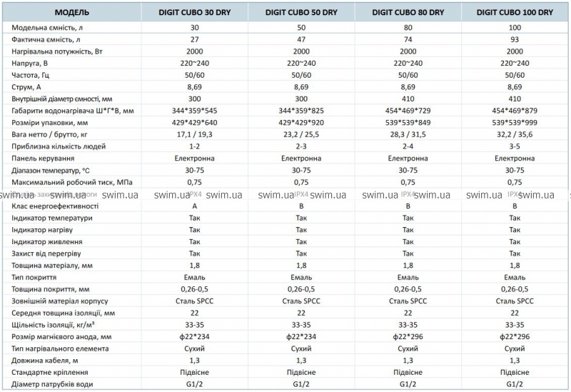 Водонагрівачі DIGIT CUBO 30/50/80/100DRY мають клас захисту IPX4 та оснащені: