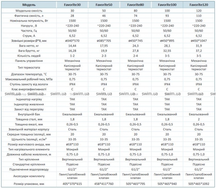 Водонагрівачі FAVORITE30/50/80/100/120 мають клас захисту IPX4 та оснащені: